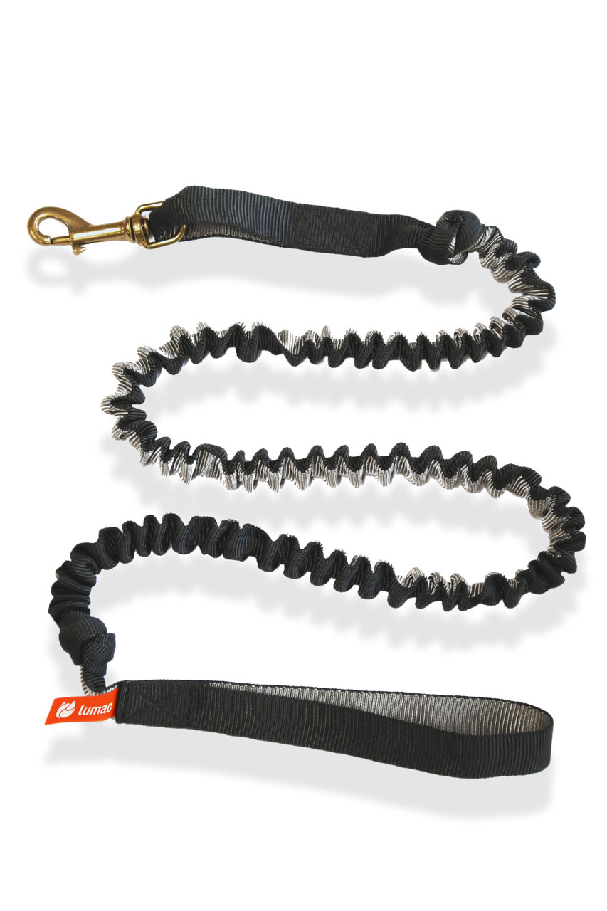Eine elastische (Canicross-) Leine im charakteristischem Lumac-Look mit (auswechselbarem) kleinem (S) oder mittlerem (M) Italian-Bronze-Karabiner.